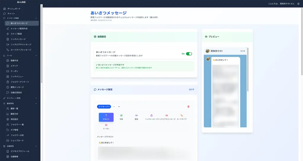 友だち追加された時に自動で相手に送るメッセージの設定が可能です。最大で3通送信可能。