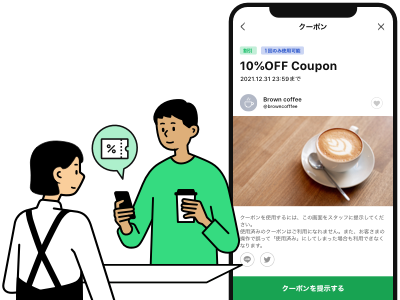 作成したクーポンは、メッセージ配信やLINE VOOM、チャットなどを使って配布できます。 クーポンを受け取ったユーザーは、お支払い時やサービス利用時にクーポン画面を提示することで、特典や割引を受けることができます。
