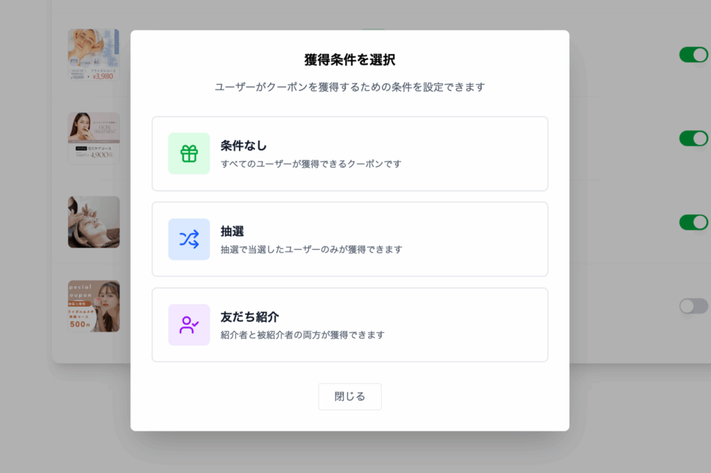 • 抽選はクーポンを開いたユーザーが抽選で当たった場合のみ使えるクーポン(確率は設定できます)