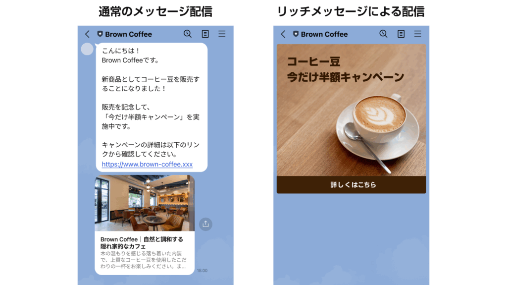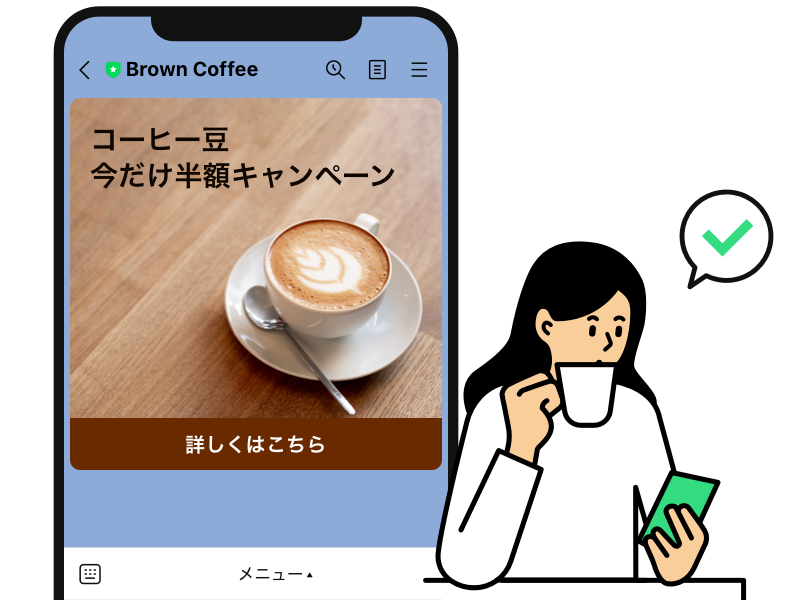 テキストを入れた画像を使うことにより、視覚的に分かりやすくして、商品やサービスの魅力を簡潔に伝えることができます。 また、通常の画像とは異なり、リッチメッセージの画像はトークルームの画面全体に大きく表示されます。そのため、ユーザーの目に留まりやすく、リンク先への誘導率を上げることができます。