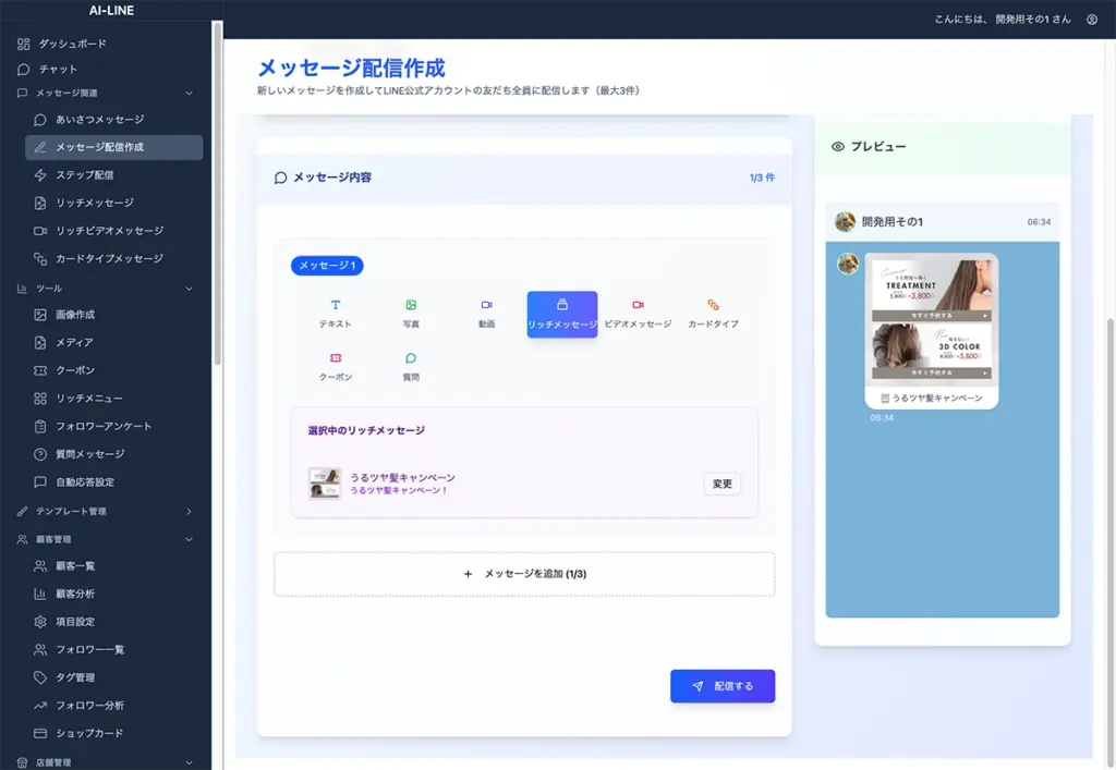 すると先ほど保存されたリッチメッセージが選択できるので、選択して「配信する」ボタンを押して完了です。