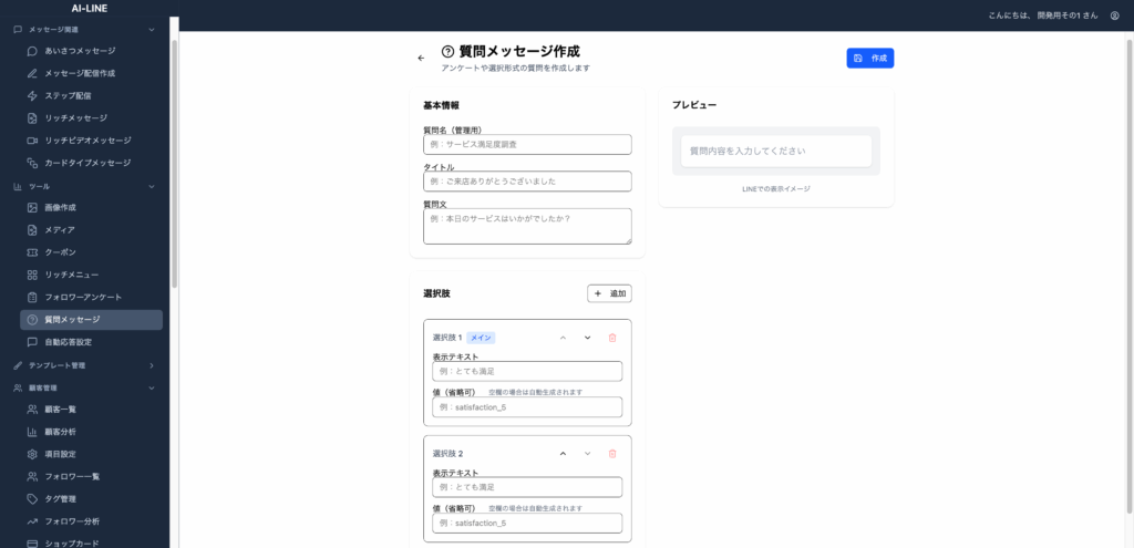 作成方法は非常にシンプルで、質問メッセージ→新規作成に進み、質問と選択肢を入力し、「作成」ボタンを押すだけです。