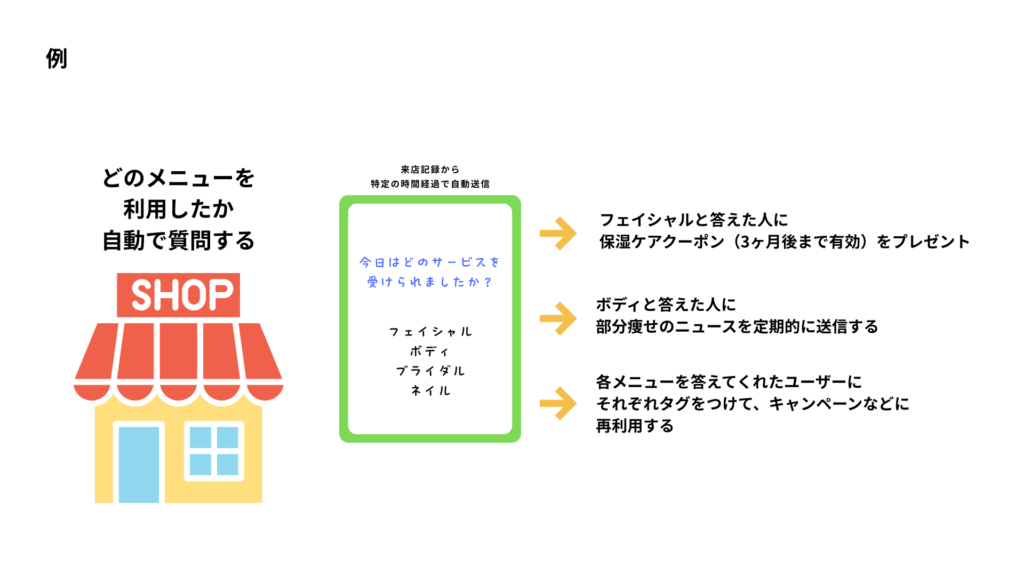 質問メッセージとは、シンプルな質問と選択肢を任意のタイミングや来店といったアクションを行なったユーザーに送信する機能です。ユーザーの考えを理解・分析できるとともに、特定の答えを選んだ人に自動でタグをつけ、次のプロモーションに活かすことができます。
